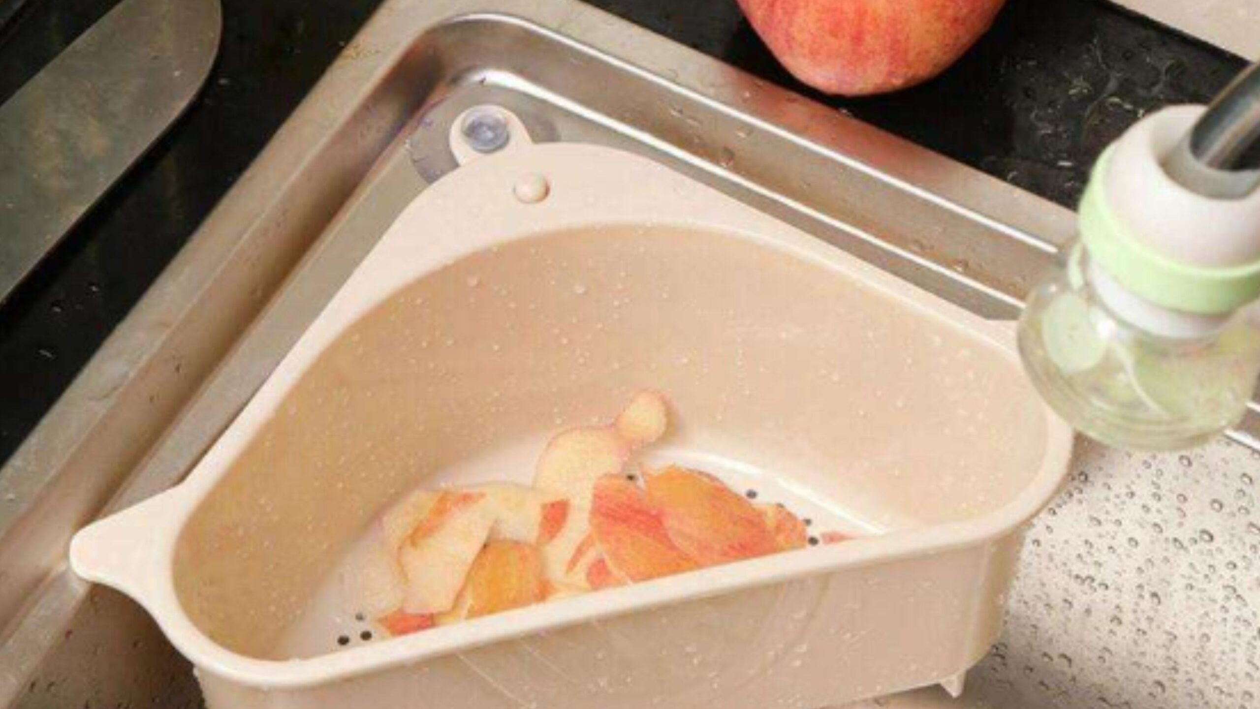 A narrator-led ad showing how a sink rack solves the common problem of clogged drains caused by food waste.